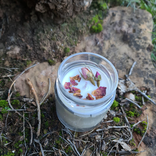 🕯️ Vela Rose Quartz: artesanal, con cuarzo rosa en bruto y aroma que simboliza el amor en todas sus formas.