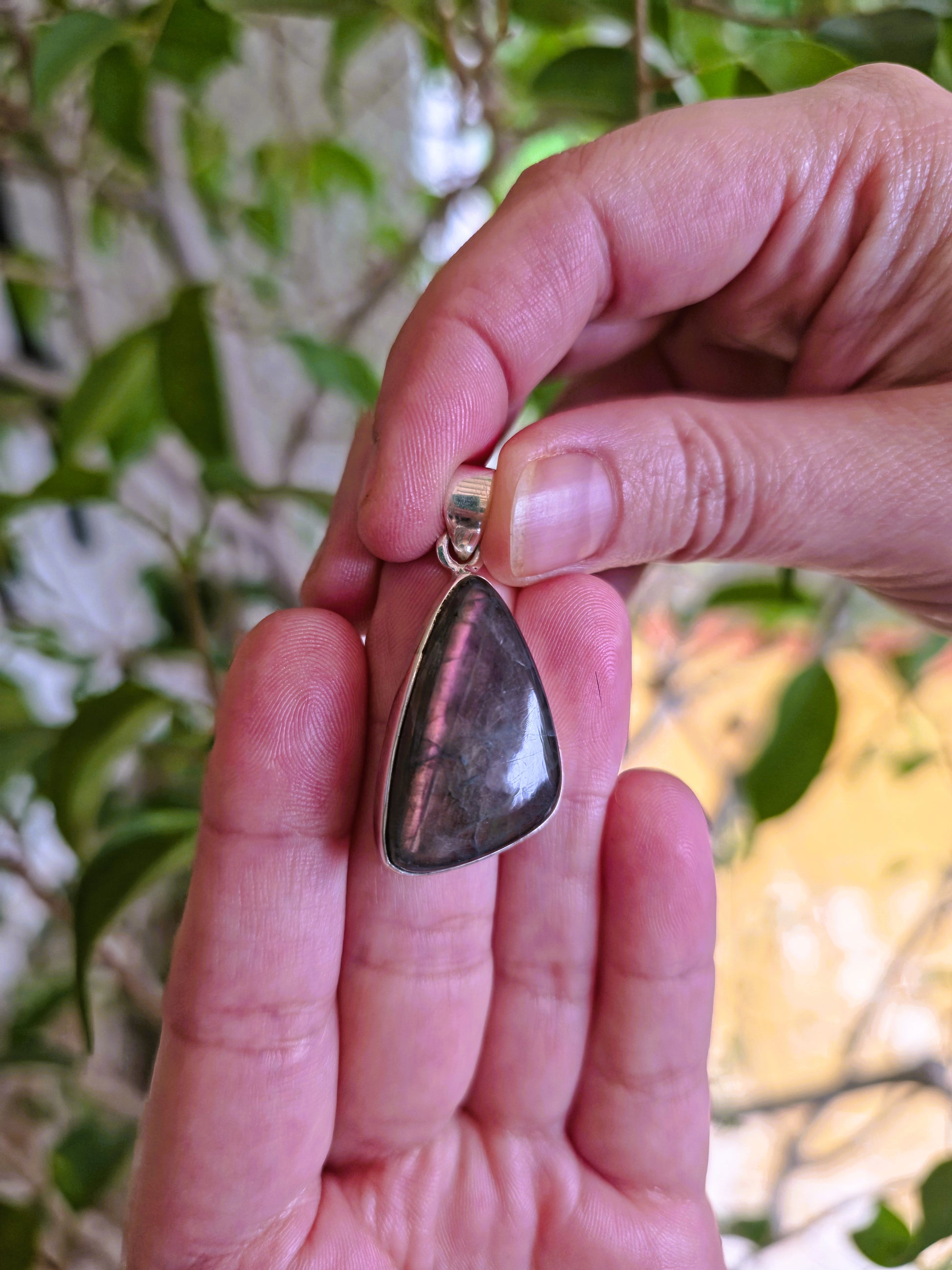 Estos colgantes de labradorita violeta de máxima calidad (AAA) destacan por su iridiscencia profunda y mística, con destellos violetas y azulados que emergen según la luz.