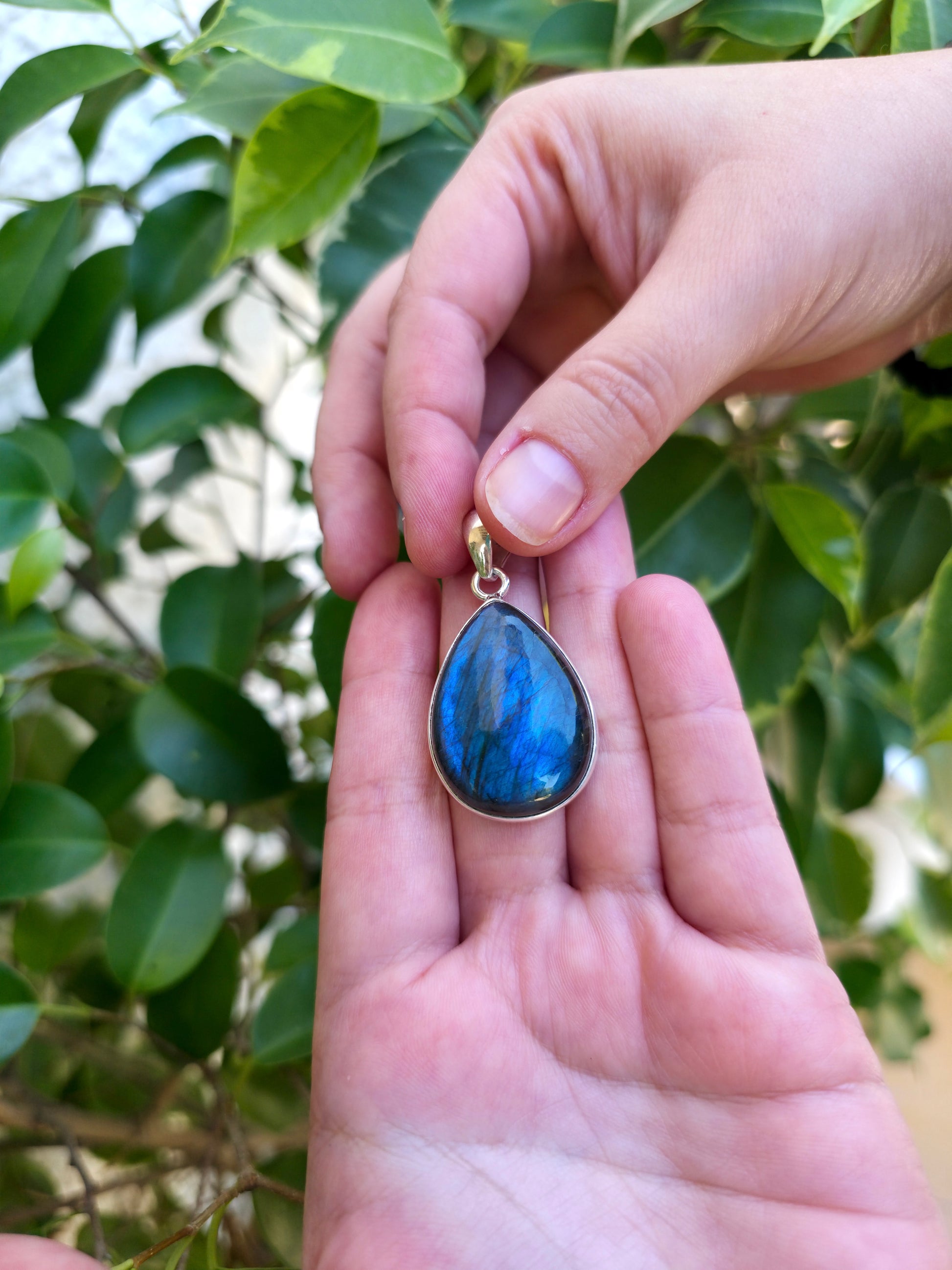 Descubre la elegancia y el poder protector de la labradorita en plata de ley, disponible en dos tamaños: 30 mm y 23 mm.